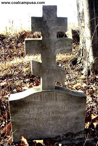 A headstone in the cemetery near Wehrum, Pa. The text appears to be Russian or Croatian or something. The graves in this cemetery date from the first three decades of the 20th Century, and