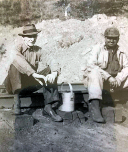Cindy shares this photo of her grandfather, Russell Elvin Dodson (left, with dinner bucket), and an unnamed coal miner relaxing on the railroad track. He grew up in Vintondale, and, as a child, carried water