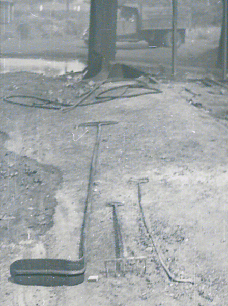 Although the Laughead works were machine drawn by the 1950s, the photographer was able to take a picture of these tools for hand-drawing ovens. In the background is a dump truck that is probably bring