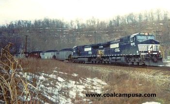 A Norfolk-Southern train winds past the spot where the Edwards shaft of the Emerald mine used to be located. Later this was known as the Gateway mine,