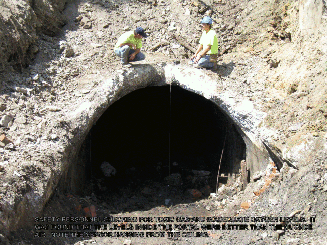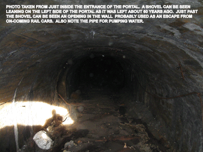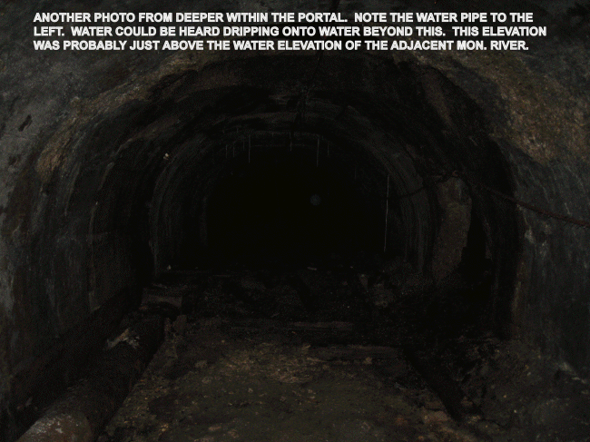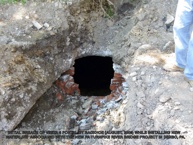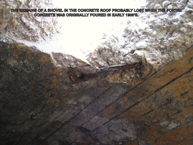 David Shannon writes, "In about 2009, I was a chief of survey for the construction manager for the turnpike project from Brownsville to California. We were excavating for the river bridge at Denbo at what I think was the Vesta 6 mine. We apparently punched into the slope entrance. The contractor had to excavate the entire opening and construct a new bulkhead but had to check air first. Turned out to be excellent air quality. We actually entered about 100' but it was flooded beyond. One pic showed a shovel left up against the side wall and another showed an old shovel that apparently fell into the concrete roof when pouring the concrete when it was built."