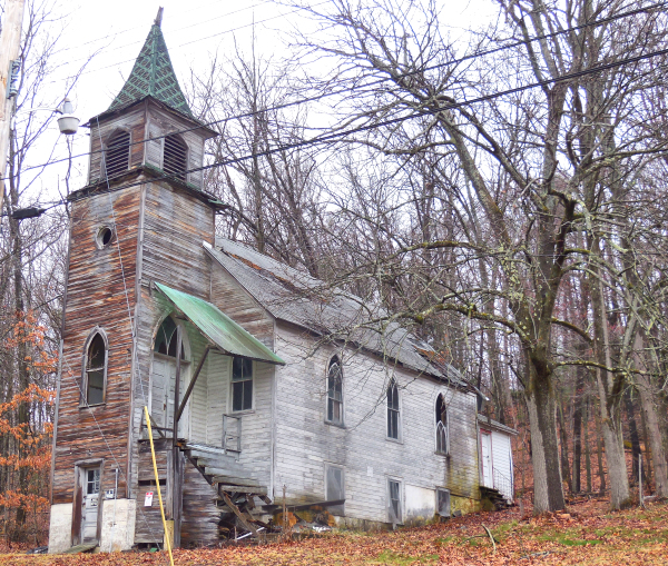 Abandoned former Slovak Lutheran church sites forlornly at the edge of Grassflat.
