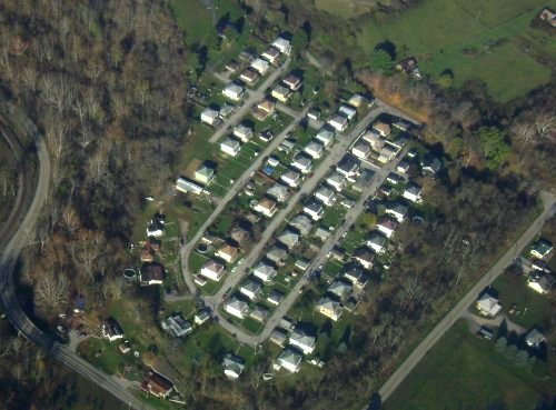 Aerial photo of Van Voorhis illustrates the grid layout of most patch towns. The mine and town were opened in 1915 by the Youghiogheny-Pittsburgh Coal Co. (Image taken from a plane by Chris H)