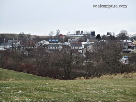 Another view of the machine shop shows, in the background, the neighboring coal patch town of Greenwald. (Jan. 2019 image by author)