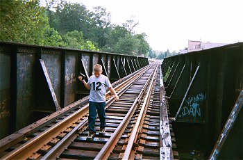 A coal patch town nomad and his camera crossing the railroad trestle in Hollsopple.