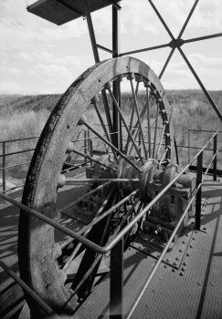 The upper sheave of the shaft hoist on the head frame.