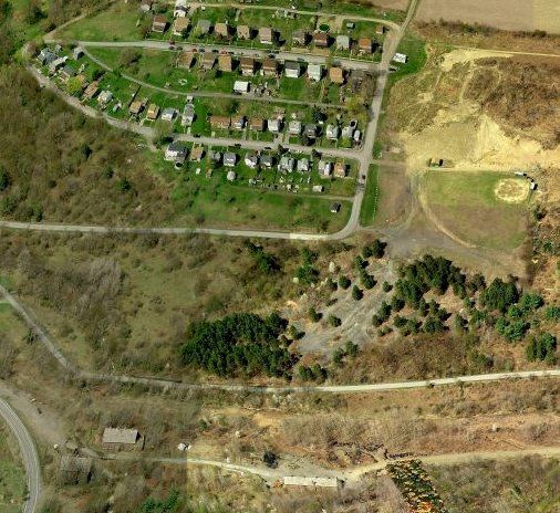 Birds eye view showing the Wilmore Heights coal company town at the top, slate dump in the center, and remaining coal mine buildings in the lower left.